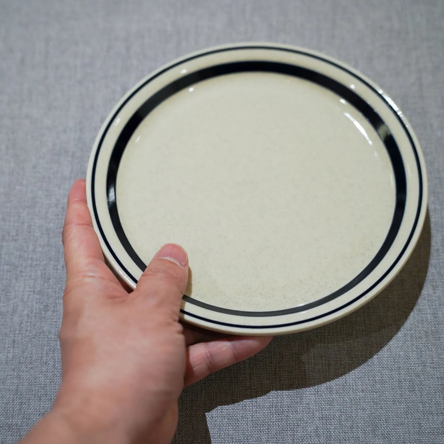 ベージュの生地に石のような表情を持つ黒い点々。それだけならナチュラルでかわいい雰囲気に収まってしまうけれど、このビストロプレートはネイビーの太いラインで締めています。急に大人な雰囲気に大変身。